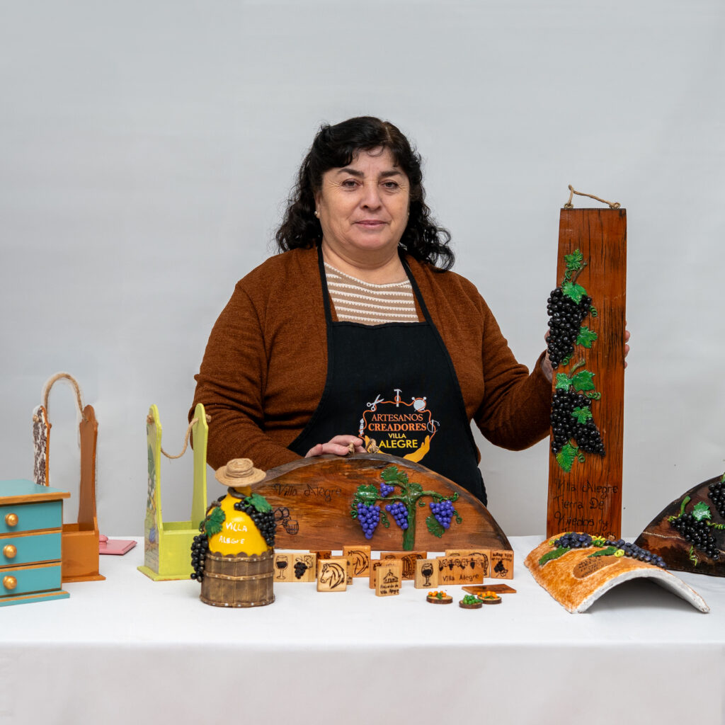 Todo comenzó cuando participé en un taller del sector de Guiones. Fue ahí donde descubrí mi interés por la artesanía, y desde entonces no he parado. Me encanta lo que hago, y es aún más gratificante cuando las personas que compran mis creaciones lo valoran y les encanta. Le pongo mucho amor y dedicación a cada pieza. Trabajo decorando tejas, madera de trupán con técnica de decoupage, y también reutilizo madera de barricas, a las que adorno con uvas en forma de parras. Además, creo imanes que destacan elementos típicos de nuestra querida comuna de Villa Alegre, como los naranjos y las uvas. Cada creación lleva un pedacito de mi tierra y de mi corazón.