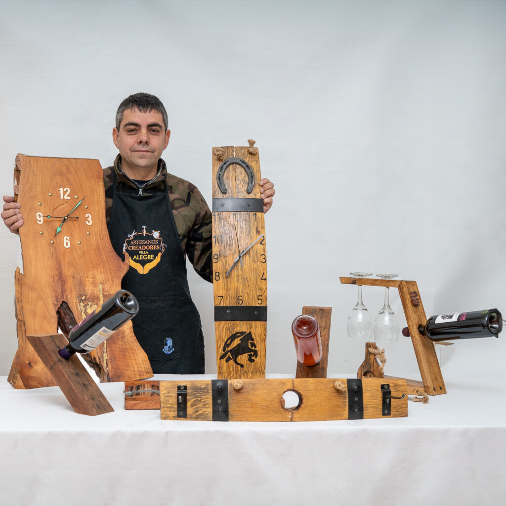 Mi nombre es Marcelino Luque, soy artesano de la comuna de Villa Alegre y llevo 12 años dedicado a la artesanía en madera, especialmente utilizando barriles recuperados de las viñas de nuestra zona. Trabajo creando relojes, espejos, mesas, percheros y también lámparas hechas con PVC reciclado.
